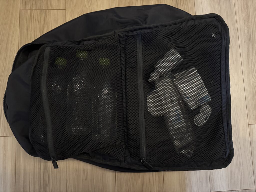 裏返してみた時のメッシュポケット、上下それぞれ500mlが3本入るほど